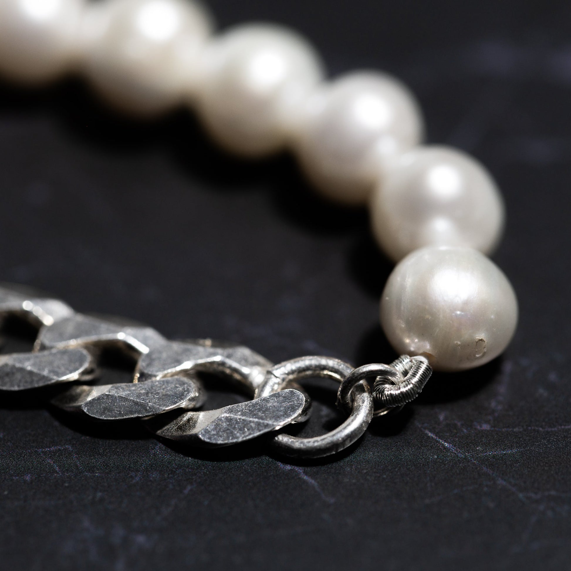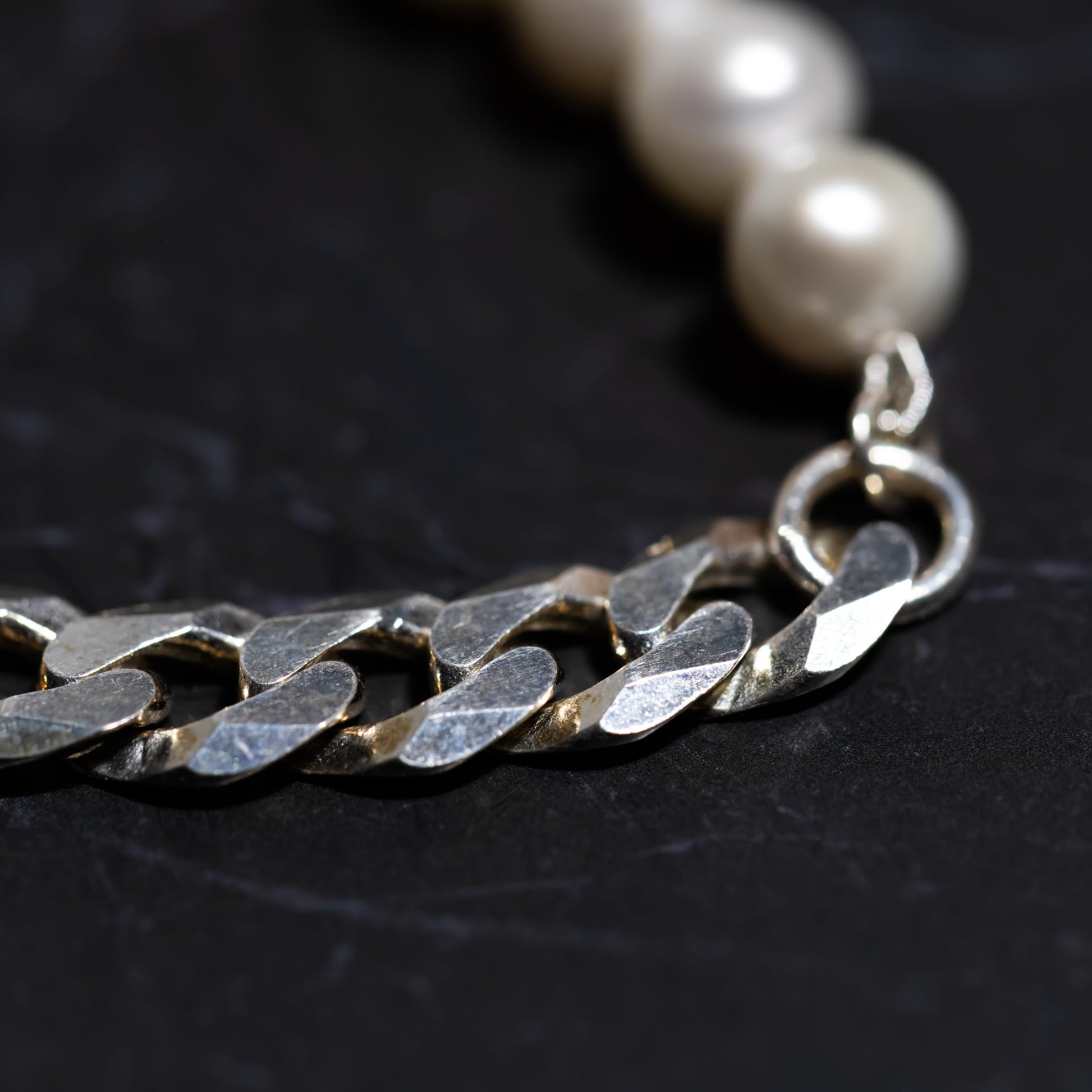 Half polished pearls, half silver link. Soft shine meets solid weight for a look that sits somewhere between classic and sharp. Balanced enough to wear every night, strong enough to stand alone.