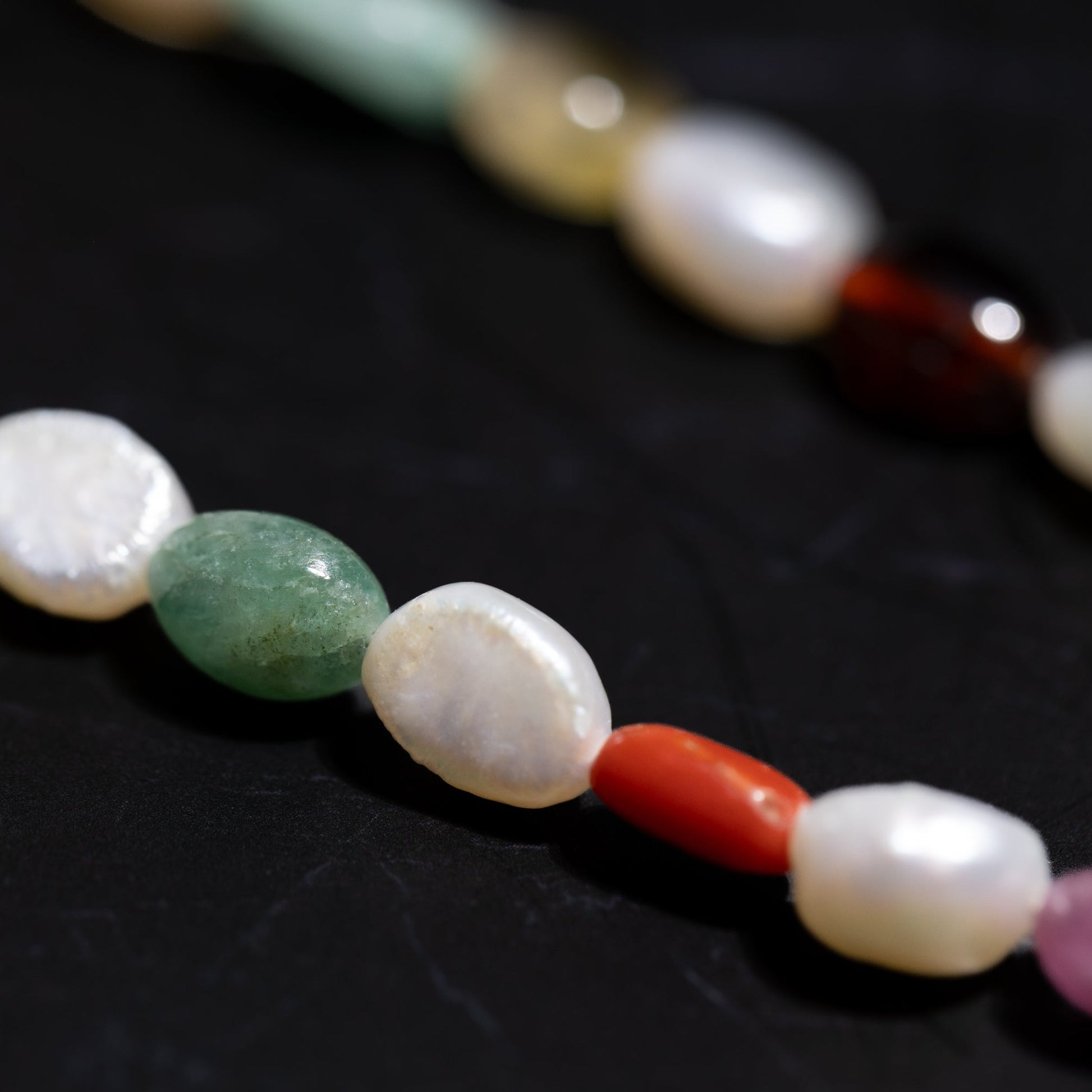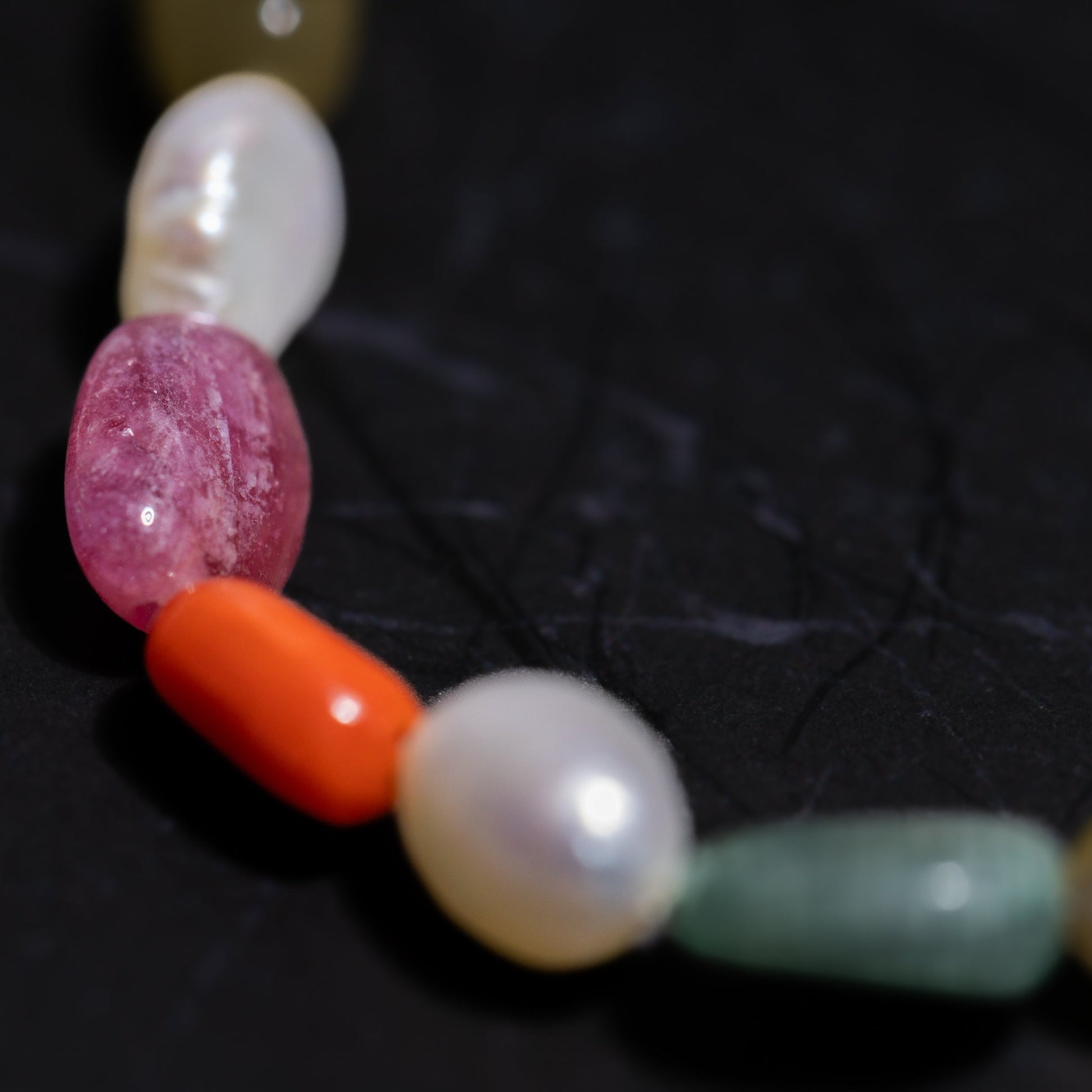 A strand of irregular pearls mixed with polished gemstones in muted, unexpected tones. Designed to feel relaxed but intentional, with just enough color to break the rules. Easy to wear solo, even better layered after dark.