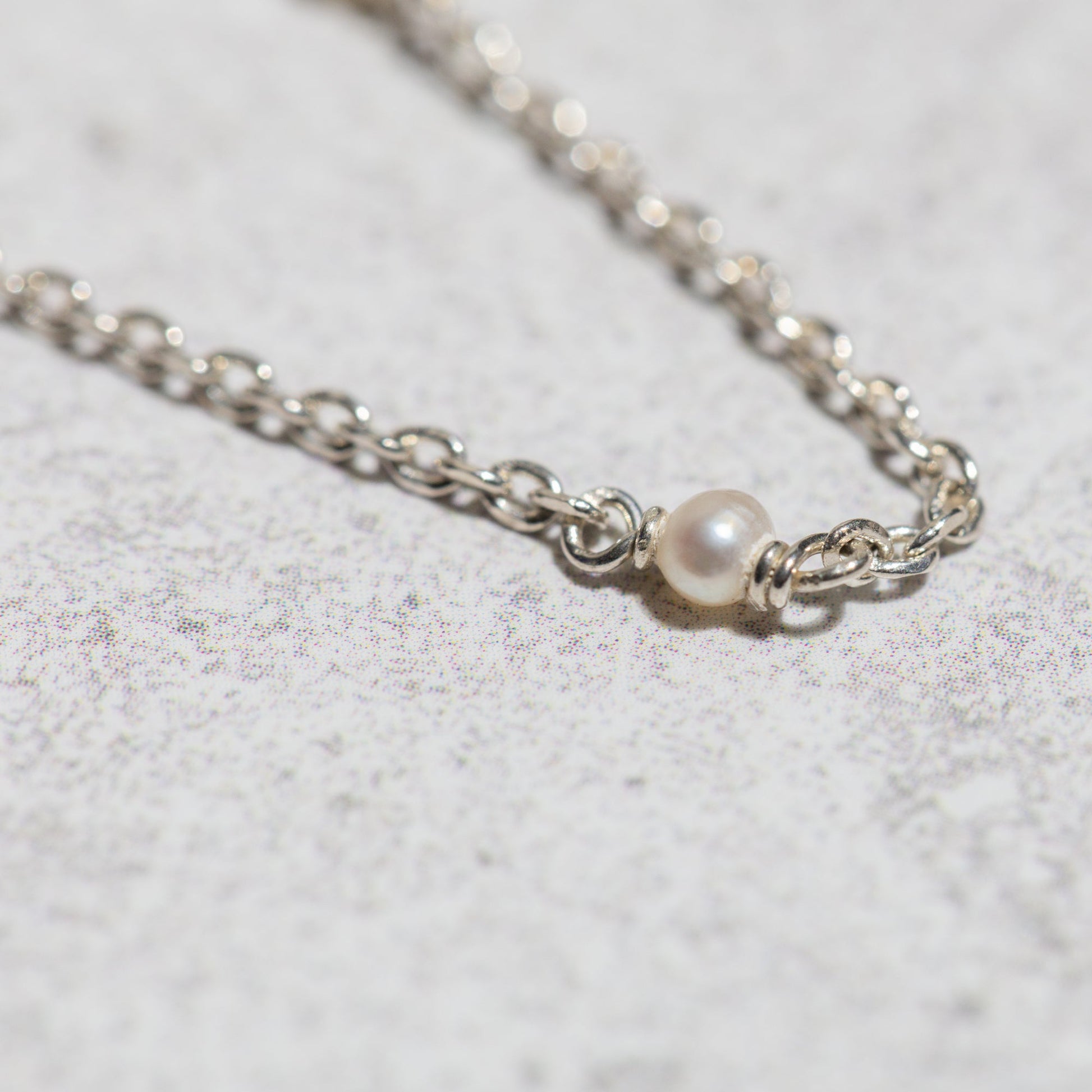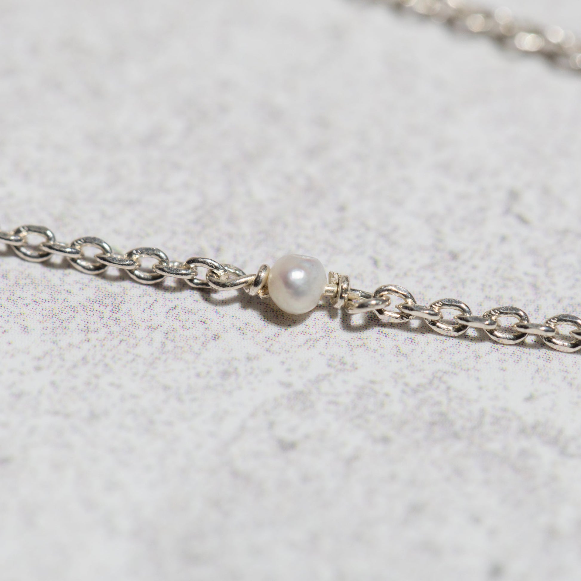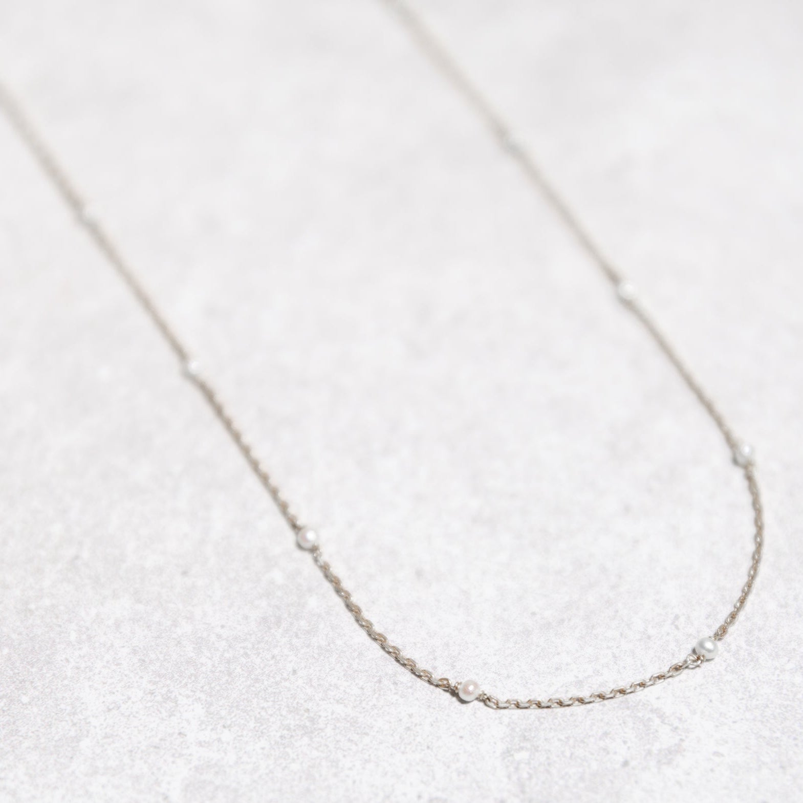 Think “barely there,” with a little something. This fine silver chain is dotted with subtle spacing and finished with petite pearls for just the right glow. Perfect for stacking, or wearing solo.