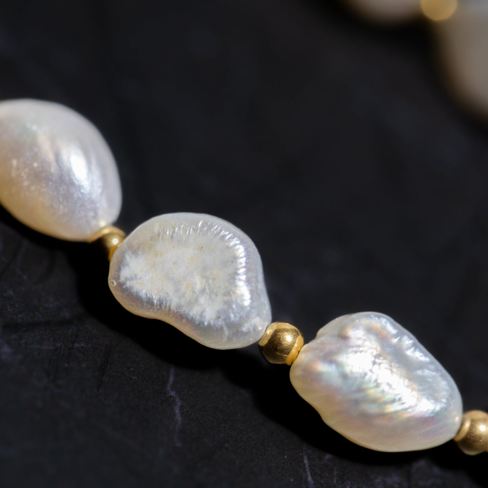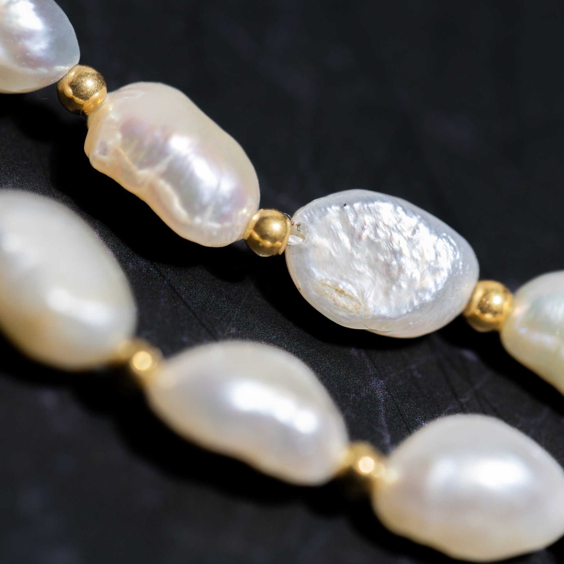 A modern pearl necklace with a little edge. Soft luster, imperfect shapes, and warm gold details that feel effortless after dark. Finished with an adjustable clasp for a fit that stays exactly where you want it.